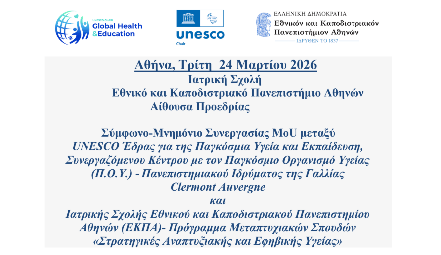 Με πρωτοβουλία της UNESCO Global Health-Education, του Συνεργαζόμενου με τον Παγκόσμιο Οργανισμό Υγείας (Π.Ο.Υ.) Κέντρου και του Πανεπιστημιακού Ιδρύματος της Γαλλίας Clermont Auvergne υπεγράφη Μνημόνιο-Σύμφωνο Συνεργασίας (ΜοU) με την Ιατρική Σχολή του Εθνικού και Καποδιστριακού Πανεπιστημίου Αθηνών (ΕΚΠΑ) και το Πρόγραμμα Μεταπτυχιακών Σπουδών «Στρατηγικές Αναπτυξιακής και Εφηβικής Υγείας». Η Συμφωνία υπεγράφη την Τρίτη 24 Μαρτίου 2026, στην Αίθουσα Προεδρίας της Ιατρικής Σχολής ΕΚΠΑ από τον Πρόεδρο της Ιατρικής Σχολής ΕΚΠΑ Καθηγητή κο Νικόλαο Αρκαδόπουλο, τον Επικεφαλής Καθηγητή της UNESCO GHE κο Didier Jourdan και την Εθνικής Εκπρόσωπο και Συν. Καθηγήτρια της UNESCO GHE κας Άρτεμις Κ. Τσίτσικα.